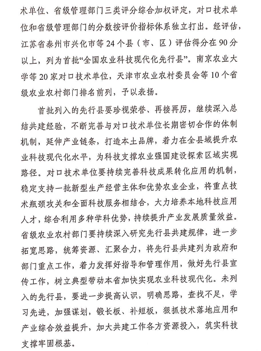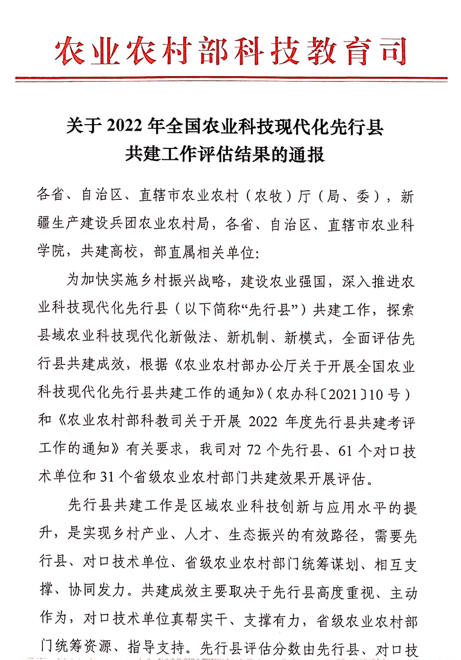 《关于2022年全国农业科技现代化先行县共建工作评估结果的通报》