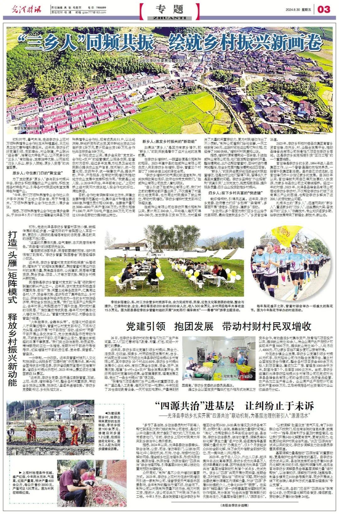 即日起,中共光泽县委宣传部、光泽县融媒体中心联合各乡镇制作推出《2024乡镇巡礼》专栏,深入宣传报道2024年各乡镇经济社会发展特色亮点,全面展现乡镇改革发展稳定取得的显著成效,生动展示光泽人民不断增强的获得感、幸福感、安全感! 今天,推出《光泽时讯》2024年8月30日刊发的李坊乡专版《“三乡人”同频共振 绘就乡村振兴新画卷》。