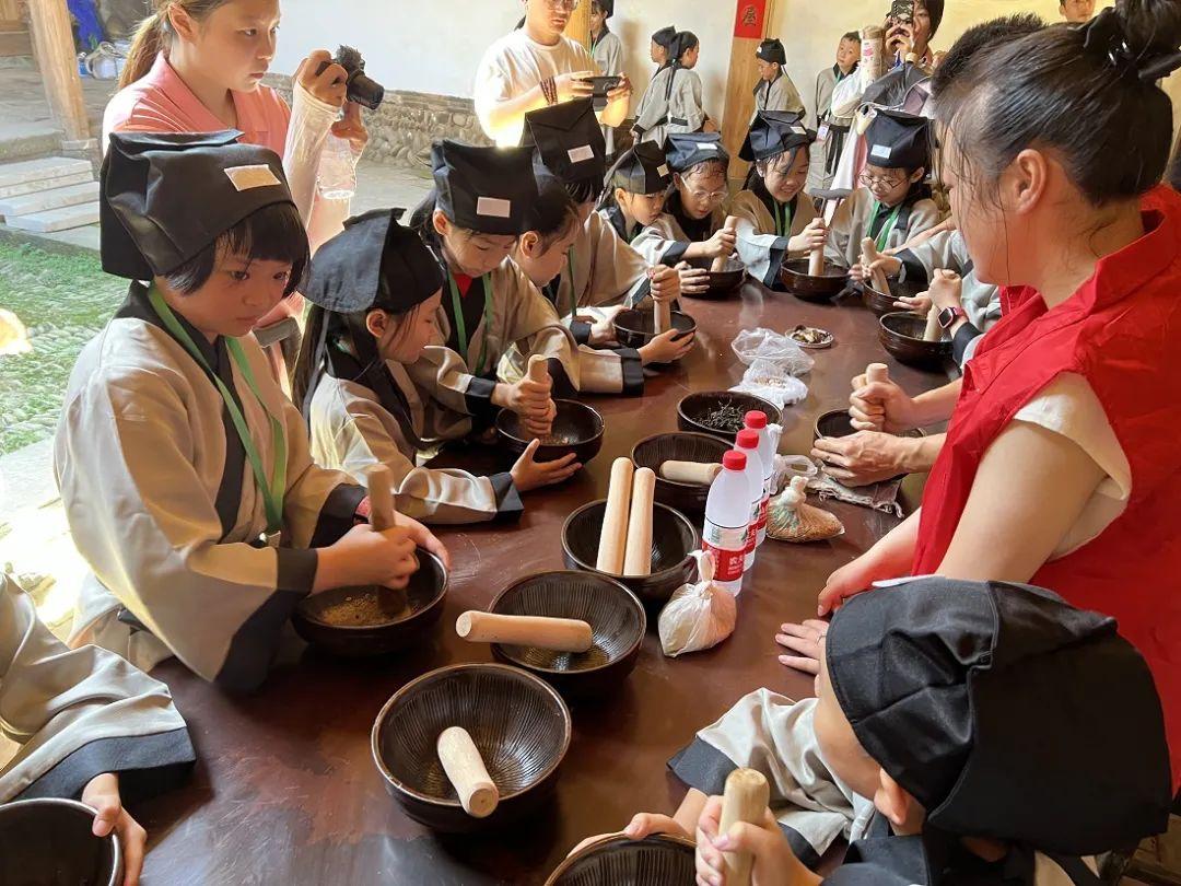 崇仁小学学生在崇仁书院体验擂茶。 此外,崇仁乡还面向崇仁中小学组织开展以非遗文化为主题的“宣讲+体验”活动。活动中,崇仁乡非遗文化宣讲员给孩子们详细介绍“建昌帮”中医炮制技艺的历史渊源、文化内涵和独特价值,并带领学生们到校外科普实践基地,亲身体验中药种植的过程;在药片切割体验区,学生们在传承人的指导下,亲手将中药材切成薄片,感受传统技艺的精湛和中医药的魅力。自2021年开展以来,2000余人次参加非遗文化进校园活动,拉近了学生与非遗文化的距离,也让非遗文化更加鲜活。 崇仁乡还通过提升非遗文化的保护和扶持力度,引进闽北古民居营造技艺传承人,秉承“修旧如旧”的原则,修缮明清古街内的省级文物保护单位裘氏家祠与裘氏民居、福字楼。如今,裘氏民居改造成为崇仁乡文创基地,作为非遗传承人活动场所,为游客提供剪纸、木活字印刷、拓印等非遗项目体验。裘氏家祠则摇身一变成为中医膳食养生馆,为周边群众和游客提供全方位的中医康养服务,推动古街与乡村旅游、健康崇仁深度融合发展。2024年以来,养生馆与古街景点、文旅活动相辅相成,吸引游客近15万余人次,带动文旅消费600余万元。 |
