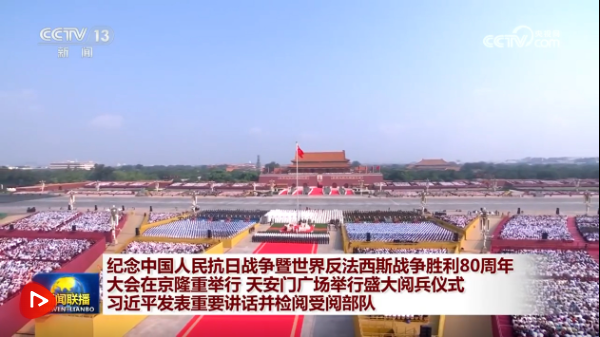 (点击看视频) 纪念中国人民抗日战争暨世界反法西斯战争胜利80周年大会在京隆重举行 天安门广场举行盛大阅兵仪式 习近平发表重要讲话并检阅受阅部队 习近平强调,隆重纪念中国人民抗日战争暨世界反法西斯战争胜利80周年,目的是铭记历史、缅怀先烈、珍爱和平、开创未来。中华民族是不畏强暴、自立自强的伟大民族。中国人民解放军始终是党和人民完全可以信赖的英雄部队。要坚定不移走中国特色社会主义道路,传承和弘扬伟大抗战精神,踔厉奋发、勇毅前行。中华民族伟大复兴势不可挡!人类和平与发展的崇高事业必将胜利! 李强主持 赵乐际王沪宁蔡奇丁薛祥李希韩正出席 61位外国领导人及有关国家高级别代表、国际组织负责人、前政要等应邀出席大会 铭记伟大历史胜利,凝聚正义和平力量。9月3日上午,纪念中国人民抗日战争暨世界反法西斯战争胜利80周年大会在北京天安门广场隆重举行,以盛大阅兵仪式,同世界人民一道纪念这个伟大的日子,共同开创更加光明的未来。中共中央总书记、国家主席、中央军委主席习近平发表重要讲话并检阅受阅部队。 中共中央政治局常委李强主持大会。中共中央政治局常委赵乐际、王沪宁、蔡奇、丁薛祥、李希,国家副主席韩正出席大会。61位外国国家元首、政府首脑及有关国家高级别代表、国际组织负责人、前政要等出席大会。 首都北京,花团锦簇,旌旗飘扬。天安门城楼庄严雄伟,天安门广场气象恢宏。人民英雄纪念碑前,"钢铁长城"主题景观巍然矗立,14座烽燧托举起"1945""2025"字样,14只"和平鸽"振翅飞翔。从空中俯瞰,广场中"众"字造型观礼台蔚为壮观,象征着在中国共产党领导下中国人民万众一心、众志成城,向着中华民族伟大复兴昂扬奋进。 上午8时35分,习近平同出席大会的外方代表团团长拾级而上,登上天安门城楼。习近平同抗战老战士老同志代表亲切握手,向他们表示崇高敬意。 《松花江上》《在太行山上》《保卫黄河》《没有共产党就没有新中国》,一首首诞生于抗战烽火中的经典歌曲连唱,让大家重温中华民族那段艰苦卓绝、气壮山河的峥嵘岁月。 8时55分,习近平等中外领导人来到天安门城楼主席台,全场爆发出雷鸣般的掌声。 电子屏幕上出现钟摆的画面。随着钟摆,1945、1955、1965……2025的年份数字依次显现。9时整,报时钟声响起,纪念大会开始。 全体肃立,80响礼炮震彻云霄,国旗护卫队官兵护卫着五星红旗,迈着矫健的步伐,从人民英雄纪念碑行进至广场北侧升旗区。中国人民解放军联合军乐团奏响雄壮的《义勇军进行曲》,全场齐声高唱中华人民共和国国歌,鲜艳夺目的五星红旗冉冉升起,在天安门广场上空高高飘扬。 在热烈的掌声中,习近平发表重要讲话。他表示,今天,我们隆重集会,纪念中国人民抗日战争暨世界反法西斯战争胜利80周年,目的是铭记历史、缅怀先烈、珍爱和平、开创未来。 习近平代表中共中央、全国人大、国务院、全国政协、中央军委,向全国参加过抗日战争的老战士、老同志、爱国人士和抗日将领,向为中国人民抗日战争胜利作出重大贡献的海内外中华儿女致以崇高敬意,向支援和帮助过中国人民抵抗侵略的外国政府和国际友人表示衷心感谢,向参加今天大会的各国来宾表示热烈欢迎。 习近平指出,中国人民抗日战争是艰苦卓绝的伟大战争。在中国共产党倡导建立的抗日民族统一战线旗帜下,中国人民以铮铮铁骨战强敌、以血肉之躯筑长城,取得近代以来反抗外敌入侵的第一次完全胜利。中国人民抗日战争是世界反法西斯战争的重要组成部分,中国人民以巨大的民族牺牲,为拯救人类文明、保卫世界和平作出了重大贡献。历史警示我们,人类命运休戚与共,各个国家、各个民族只有平等相待、和睦相处、守望相助,才能维护共同安全,消弭战争根源,不让历史悲剧重演。 习近平强调,中华民族是不畏强暴、自立自强的伟大民族。当年,面对正义与邪恶、光明与黑暗、进步与反动的生死较量,中国人民同仇敌忾、奋起反抗,为国家生存而战,为民族复兴而战,为人类正义而战。今天,人类又面临和平还是战争、对话还是对抗、共赢还是零和的抉择。中国人民坚定站在历史正确一边、站在人类文明进步一边,坚持走和平发展道路,与各国人民携手构建人类命运共同体。 习近平指出,中国人民解放军始终是党和人民完全可以信赖的英雄部队。全军将士要忠实履行神圣职责,加快建设世界一流军队,坚决维护国家主权、统一、领土完整,为实现中华民族伟大复兴提供战略支撑,为世界和平与发展作出更大贡献。 习近平强调,新时代新征程,全国各族人民要在中国共产党坚强领导下,坚持马克思列宁主义、毛泽东思想、邓小平理论、"三个代表"重要思想、科学发展观,全面贯彻新时代中国特色社会主义思想,坚定不移走中国特色社会主义道路,传承和弘扬伟大抗战精神,踔厉奋发、勇毅前行,为以中国式现代化全面推进强国建设、民族复兴伟业而团结奋斗。 习近平最后强调,中华民族伟大复兴势不可挡!人类和平与发展的崇高事业必将胜利! 习近平讲话结束时,全场响起长时间热烈掌声。 9时15分,阅兵仪式开始,标兵就位,军乐团吹响阅兵式号角。习近平乘红旗检阅车,经过金水桥,驶上长安街。阅兵总指挥韩胜延报告受阅部队列队完毕,习近平下达检阅开始的命令。中国共产党党
