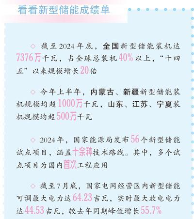 用电高峰时放电,低谷时充电——这种被形象称作“充电宝”的储能系统,应用范围正在不断扩大。 国家能源局近日发布的《中国新型储能发展报告(2025)》(以下简称《报告》)显示,截至2024年底,全国已建成投运新型储能7376万千瓦/1.68亿千瓦时,装机规模占全球总装机比例超过40%。中国新型储能规模已跃居世界第一。 建储能,“存绿电” 西藏山南,曲松县加娃村山口,一座光储电站里,几排白色的储能装置不时发出低鸣。“这是为了光伏发电配套建设的储能装置,电站白天发的电暂时在这里‘存起来’,夜里用电需求大时送出去,避免电力浪费。”华能雅江新能源分公司总经理崔光泽说。 青海海南州,15万千瓦/60万千瓦时的储能项目于去年8月顺利并网并实现满功率运行——这是全球海拔最高、规模最大的高压直挂储能系统项目,单机容量达2.5万千瓦/10万千瓦时,可单机独立接受电网调控。该系统无需工频变压器,系统效率提升4%至6%,可实现10毫秒内快速响应。 …… 建储能,“存绿电”,是中国大力发展可再生能源、着力建设新型电力系统大势下的主动选择。取自于自然的风、光等可再生能源供应不定,每当极热无风、晚峰无光,新能源发电就会面临出力不稳定的问题。建设新型储能,就好像配上了“充电宝”“调度站”,当烈日灼灼、风电满发,它能把用不完的绿电“存起来”,到了无风无光或用电高峰期,再及时“放电补能”,让千家万户灯光不熄、工厂机器运作不停。 数据显示,截至2024年底,全国新型储能装机达7376万千瓦,占全球总装机40%以上,年均增速超130%,“十四五”以来规模增长20倍。截至今年6月底,全国新型储能装机规模达到9491万千瓦/2.22亿千瓦时,较2024年底增长约29%。其中,内蒙古、新疆装机规模均超1000万千瓦,山东、江苏、宁夏装机规模均超500万千瓦。 新型储能规模何以实现快速增长?这与明晰的政策引领密不可分。 翻阅能源法,“推进新型储能高质量发展”列于其中;“发展新型储能”则首次写入今年的政府工作报告,明确新型储能功能定位是发挥其在新型电力系统中的调节作用。此外,《加快构建新型电力系统行动方案(2024—2027年)》《关于支持电力领域新型经营主体创新发展的指导意见》等多项政策文件,则不断促进健全电力市场机制,引导其实现科学发展。 “目前,新型储能应用效果逐步显现,2024年全年新型储能调用情况相较2023年大幅提升,浙江、江苏、重庆、新疆等多省份年均等效利用小时数达到1000小时以上,成为促进新能源开发消纳的重要手段。迎峰度夏期间,新型储能充分发挥‘超级充电宝’功效,为顶峰时段电力保供贡献了关键力量。”国家能源局能源节约和科技装备司副司长边广琦说。 “应用一代、示范一代、预研一代” 安徽宿州,全国最大“煤电+熔盐”储能项目近日完成168小时试运行,正式投产——这是全国首台(套)吉瓦时级煤电熔盐储换热成套装备及控制系统,也是国家首批绿色低碳先进技术示范项目。 “熔盐储热技术的引入,就像为传统热电联产机组外接了一个‘储热宝’。”国家能源集团安徽公司宿州电厂有关负责人介绍。在机组调峰压力较小时,可用蒸汽加热熔盐,将热量储存至“储热宝”;在用电高峰期、低谷期时,利用“储热宝”对外供热,支撑机组全力参与调峰,实现顶尖峰满发或压低谷调峰。“闲时储热,忙时供热”,提升了机组的调节灵活性,解决了煤电机组供热、供电难以兼顾的问题。 这是储能行业不断创新项目应用的一个缩影。《报告》显示,储能领域多类型技术路线加快落地实施。截至2024年底,各类新型储能技术路线中,锂离子电池储能占据主导地位。同时,各项储能技术创新取得新进展。锂离子电池储能技术水平持续提升;多类新型储能技术向商业化应用过渡;一批新型储能技术加速示范应用。 透过不断更新的技术创新成果,可窥见中国新型储能“应用一代、示范一代、预研一代”的梯次发展生态。边广琦介绍,去年,国家能源局发布56个新型储能试点项目,涵盖十余种技术路线。其中,多个试点项目为国内首次工程应用,总体呈现多元化发展态势,有力促进新型储能关键技术和装备实现突破。与此同时,12个新型储能项目入选为第四批能源领域首台(套)重大技术装备的依托工程,为首台(套)重大技术装备落地转化提供了应用场景。 “当前,中国新型储能的技术创新从单一突破转向体系化布局,为新型电力系统构建提供了全周期技术保障。”南方电网公司首席科学家饶宏举例,比如,锂电主导技术实现代际跃迁,在电池本体、热管理、系统并网技术等方面快速迭代;压缩空气储能、液流电池储能、飞轮储能等实现工程化突破,为高比例新能源电力系统所需的长时调节能力等奠定了技术基础;半固态电池、全固态电池、氢储能技术等一批前沿颠覆性技术加速发展,以应对未来新型电力系统对于多时间尺度、高安全性能存储、极端环境适应性等需求。 “通过规模化应用和示范项目建设运营,验证了不同技术的可行性和经济性,进一步推动新技术迭代升级,实现多种技术路线良性健康发展。”饶宏说。 新型储能技术路线“百花齐放”,还离不开持续健全的行业标准体系。据介绍,2024年,超过20项电化学储能标准发布实施,多项标准立项,覆盖规划设计、接入电网、运行控制、检修试验、后评价等多个环节,我国新