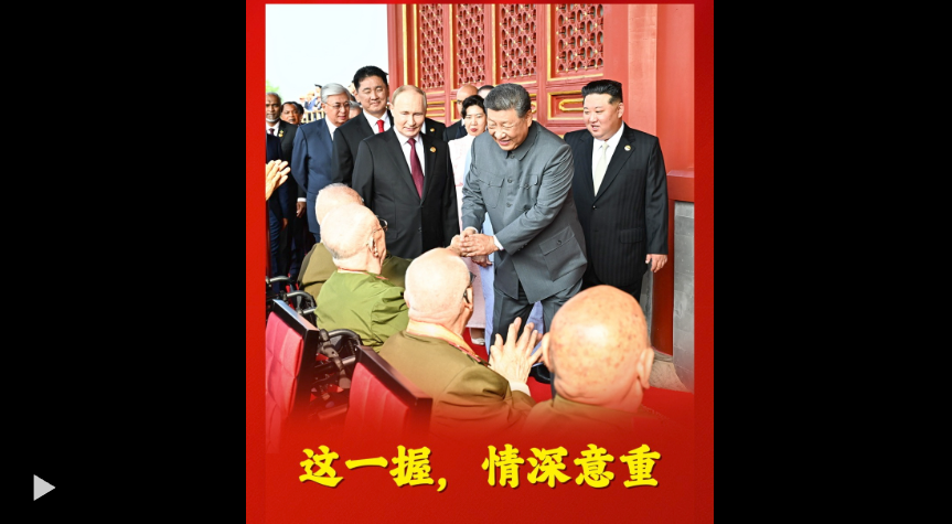 习近平总书记来到6位抗战老战士老同志身边,微笑着俯下身,同他们的手紧紧握在一起。