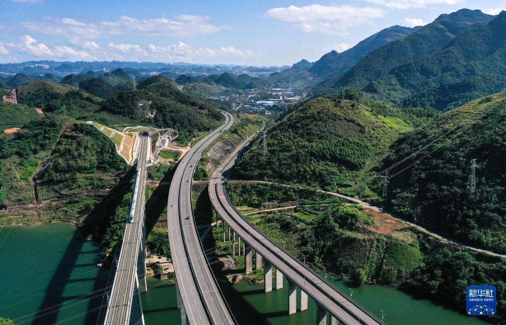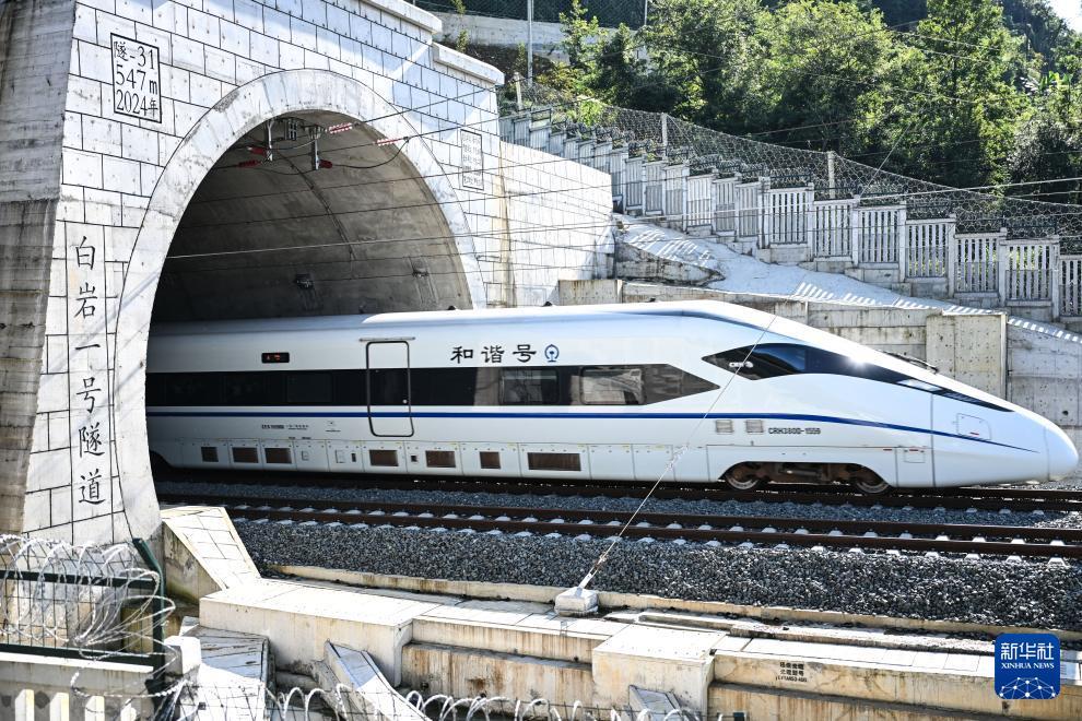 10月17日,运行试验列车经过贵州盘兴高铁三标段白岩一号隧道(无人机照片)。 目前,新建贵州盘州至兴义高速铁路进入运行试验阶段,线路开通进入倒计时。 盘兴高铁设计时速250公里,正线长度约98公里,全线共设车站3座。盘兴高铁是贵州省实现"市市通高铁"目标的最后一个项目,项目建成通车后,贵阳至兴义2小时可达,对完善区域铁路网布局,促进当地经济发展具有重要意义。 新华社记者 杨文斌 摄
