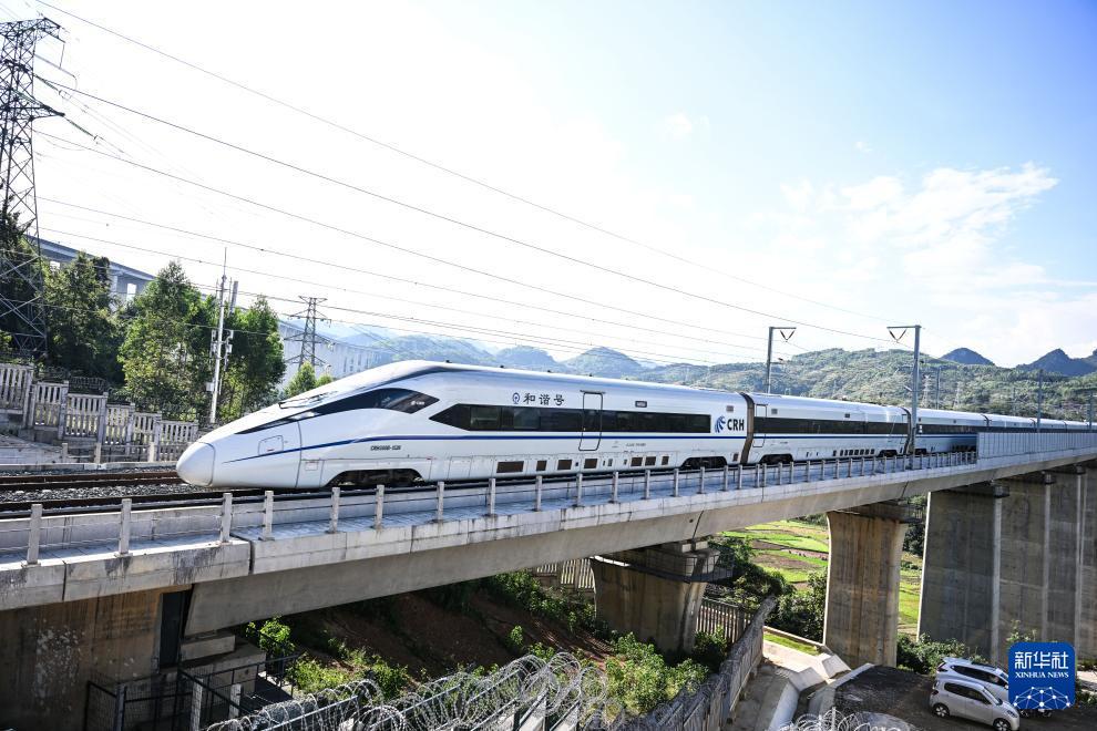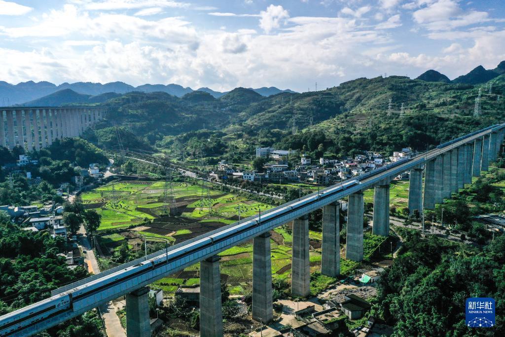 10月17日,运行试验列车经过贵州盘兴高铁三标段清水河镇特大桥(无人机照片)。 目前,新建贵州盘州至兴义高速铁路进入运行试验阶段,线路开通进入倒计时。 盘兴高铁设计时速250公里,正线长度约98公里,全线共设车站3座。盘兴高铁是贵州省实现"市市通高铁"目标的最后一个项目,项目建成通车后,贵阳至兴义2小时可达,对完善区域铁路网布局,促进当地经济发展具有重要意义。 新华社记者 杨文斌 摄