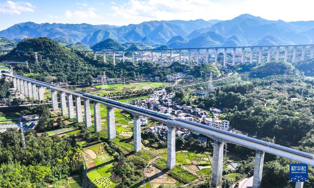 10月17日,运行试验列车经过贵州盘兴高铁三标段纳怀河特大桥(无人机照片)。 目前,新建贵州盘州至兴义高速铁路进入运行试验阶段,线路开通进入倒计时。 盘兴高铁设计时速250公里,正线长度约98公里,全线共设车站3座。盘兴高铁是贵州省实现"市市通高铁"目标的最后一个项目,项目建成通车后,贵阳至兴义2小时可达,对完善区域铁路网布局,促进当地经济发展具有重要意义。 新华社记者 杨文斌 摄