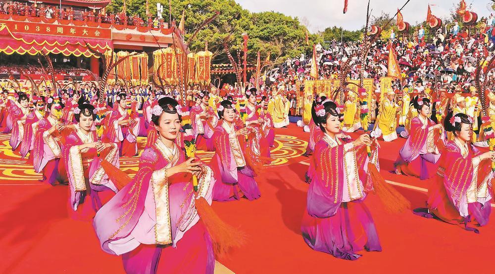 10月29日至31日,莆田湄洲妈祖祖庙旌旗飘扬、鼓乐喧天、人潮涌动,纪念妈祖羽化升天1038周年暨妈祖金身巡安湄洲岛系列活动在此举行,两岸5000多名信众聚首湄洲岛,同谒妈祖、共襄盛会。图为开幕式现场。 福建日报报业集团记者 陈盛钟 通讯员 程黎婷 林春盛 林鹏 摄影报道