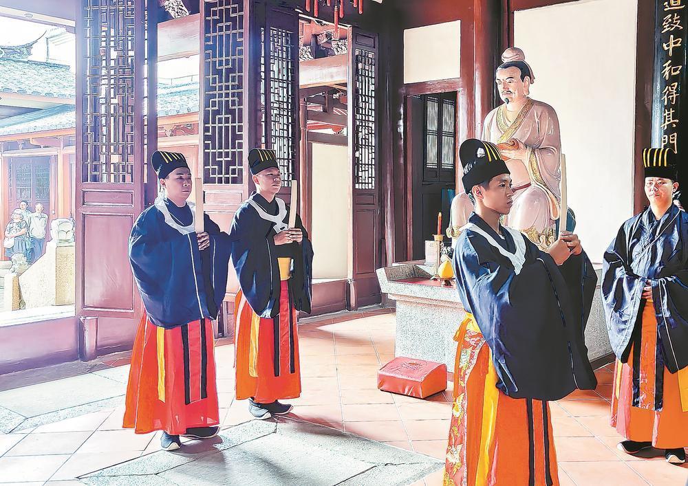 10月底,“两岸同心・文脉同源”乙巳年榕台联合祭孔交流活动暨榕台武术交流会在福州举办。在仓山区螺洲镇孔庙,榕台青年身着传统服饰,向孔子像行三献礼。榕台青年还通过聆听儒家文化讲座、学习中华武术等活动,感受博大精深的中华传统文化,增进同胞情谊。福建日报通讯员 陈仪 摄影报道 |