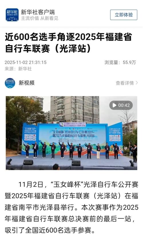 11月2日,“玉女峰杯”光泽自行车公开赛暨2025年福建省自行车联赛(光泽站)在光泽县举行。本次赛事作为2025年福建省自行车联赛总决赛前的最后一站,吸引了全国近600名选手参赛,获新华社客户端、新华网、中国日报网关注,发布《近600名选手角逐2025年福建省自行车联赛(光泽站)》的报道。(宓盈婷 罗建英)