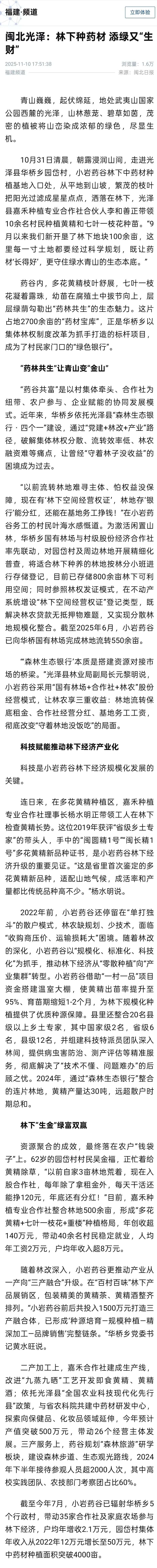 华桥乡小岩药谷林下中药材种植基地内多花黄精枝叶舒展,七叶一枝花凝着露珠,幼苗在腐殖土中拔节向上,层层绿荫勾勒出“药林共生”的生态魅力。这片占地2700余亩的“药材宝库”,正是华桥乡以集体林权制度改革为抓手打造的标杆项目,成为了村民家门口的“绿色银行”,获新华社客户端、光明网关注,发布《闽北光泽:林下种药材 添绿又“生财”》的报道。
