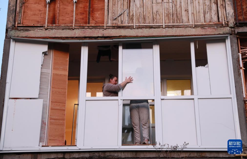 11月14日,在乌克兰首都基辅市第聂伯区,当地居民对遭受空袭损毁的房屋进行修缮加固。 当天凌晨,基辅遭到俄军大规模空袭。 新华社记者 李东旭 摄