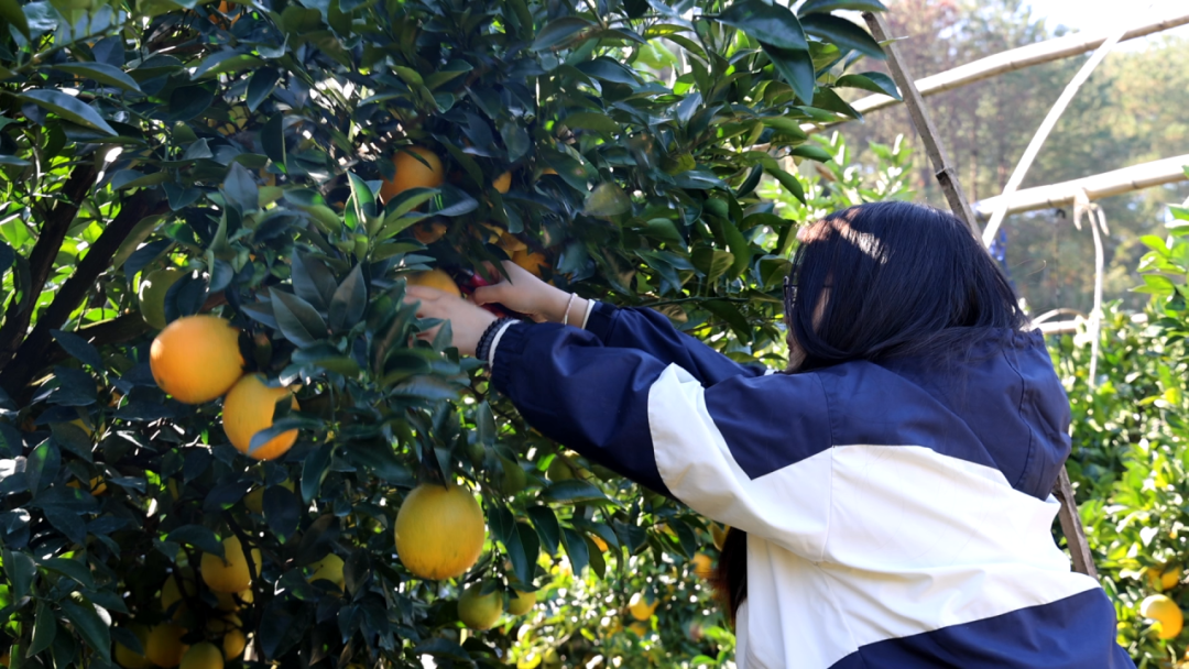 在果园里,10多名游客正提着桶穿梭在果树之间,迫不及待地将成熟的脐橙采摘下来,片刻功夫便装满一桶,整个果园处处欢声笑语。 游客肖女士:“这边的橙子非常大一片,个头也很大,金黄金黄的,我们刚刚尝了一下,肉厚、汁水也很多,非常甜。”