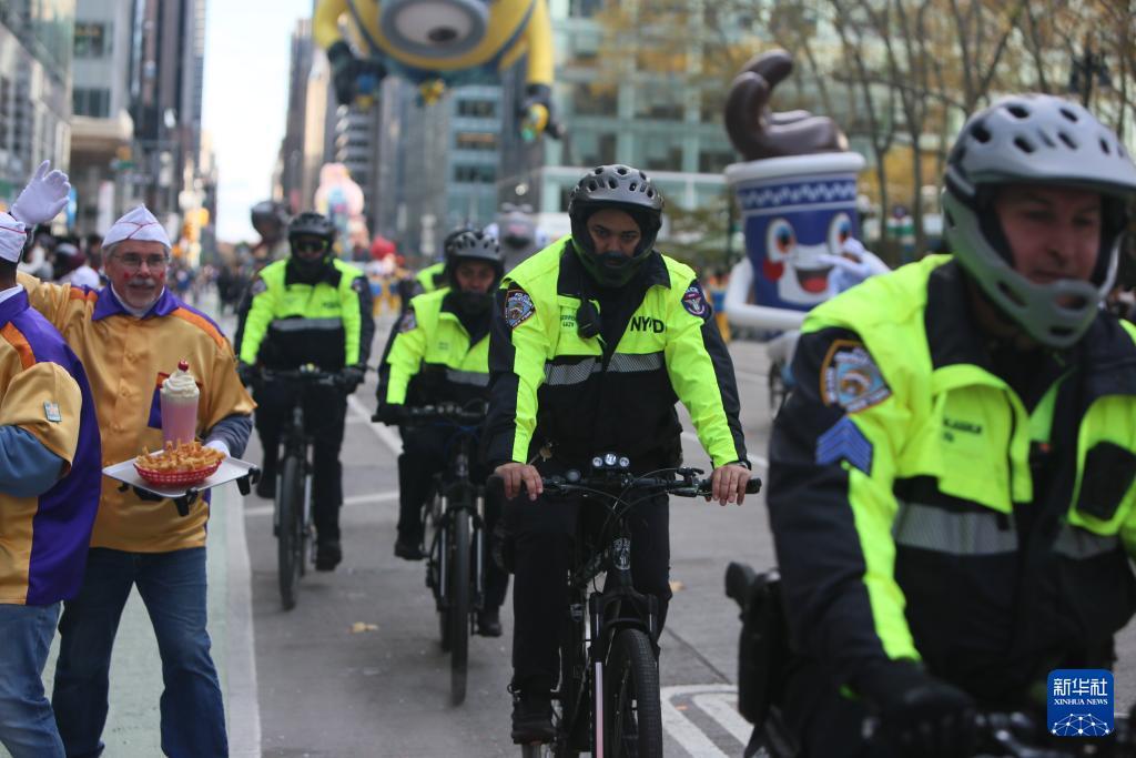 11月27日,在美国纽约,警察在感恩节游行活动现场骑车巡逻。 由于近期美国发生多起安全事件,纽约在感恩节游行区域设置了数百个检查点和隔离区,部署了数千名警力并动用无人机,加强安全防范措施。 新华社记者 张凤国 摄