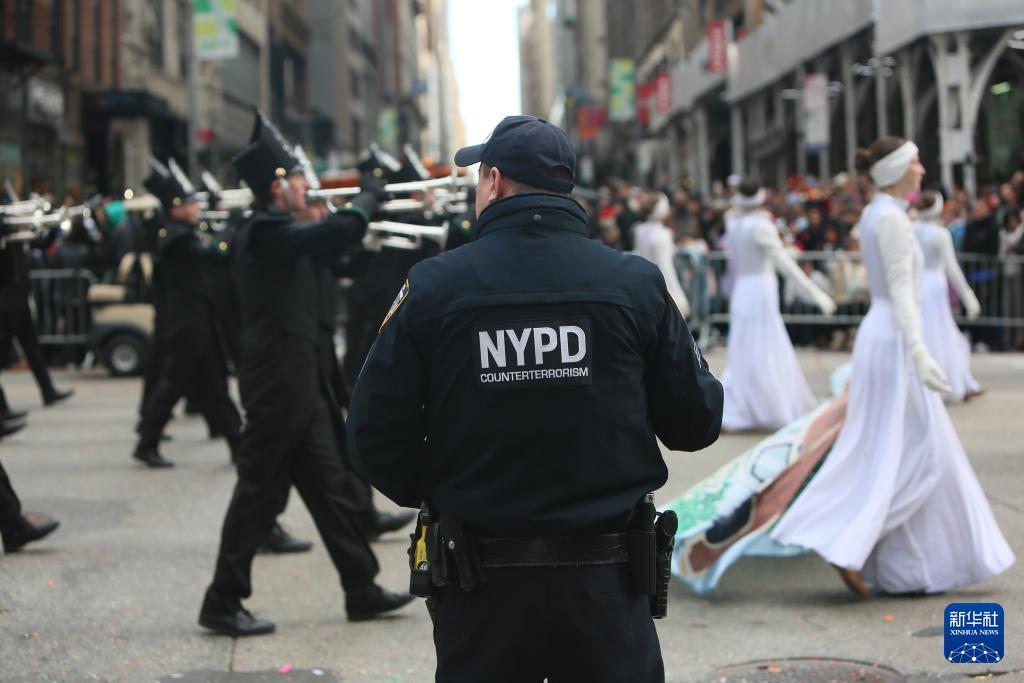 11月27日,在美国纽约,警察在感恩节游行活动现场值守。 由于近期美国发生多起安全事件,纽约在感恩节游行区域设置了数百个检查点和隔离区,部署了数千名警力并动用无人机,加强安全防范措施。 新华社记者 张凤国 摄