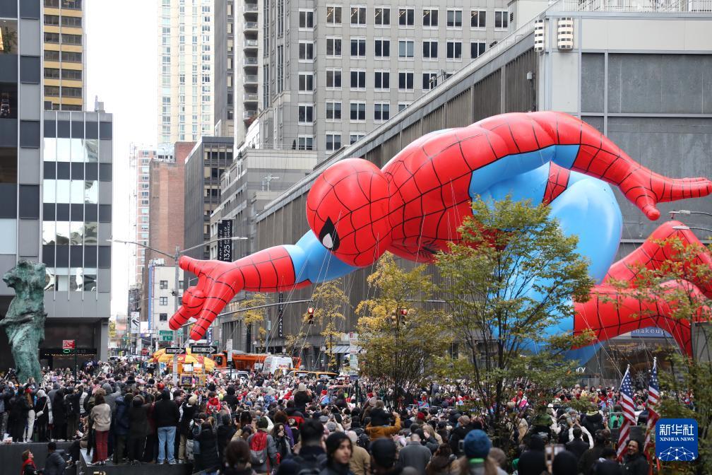 11月27日,在美国纽约,民众观看感恩节游行上的蜘蛛侠气球。 由于近期美国发生多起安全事件,纽约在感恩节游行区域设置了数百个检查点和隔离区,部署了数千名警力并动用无人机,加强安全防范措施。 新华社记者 张凤国 摄