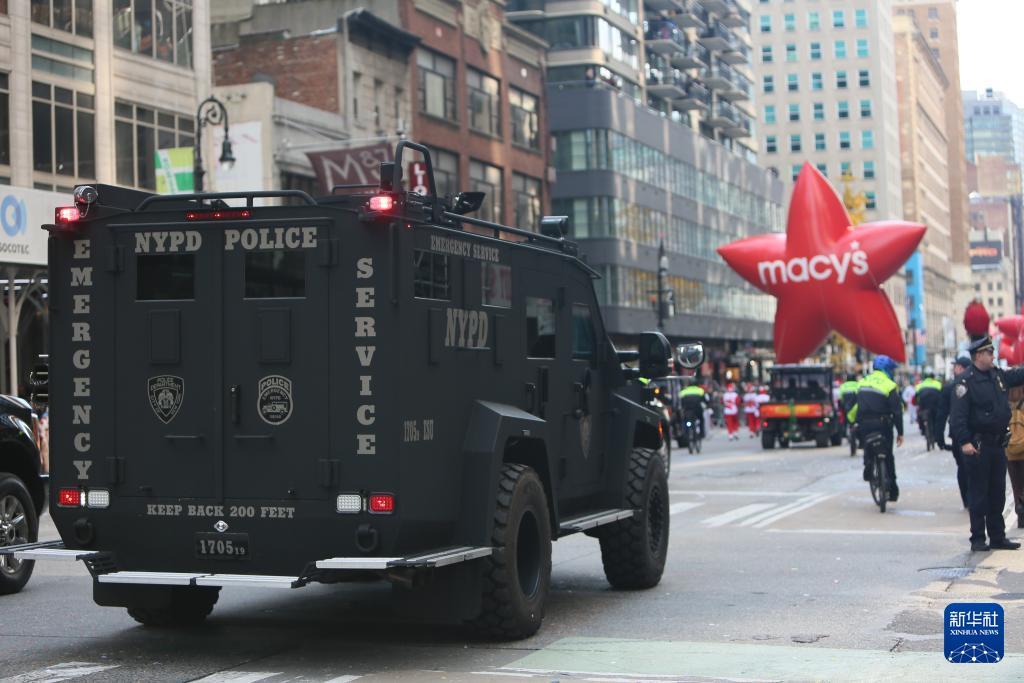 11月27日,在美国纽约,警方应急车辆在感恩节游行活动现场巡逻。 由于近期美国发生多起安全事件,纽约在感恩节游行区域设置了数百个检查点和隔离区,部署了数千名警力并动用无人机,加强安全防范措施。 新华社记者 张凤国 摄