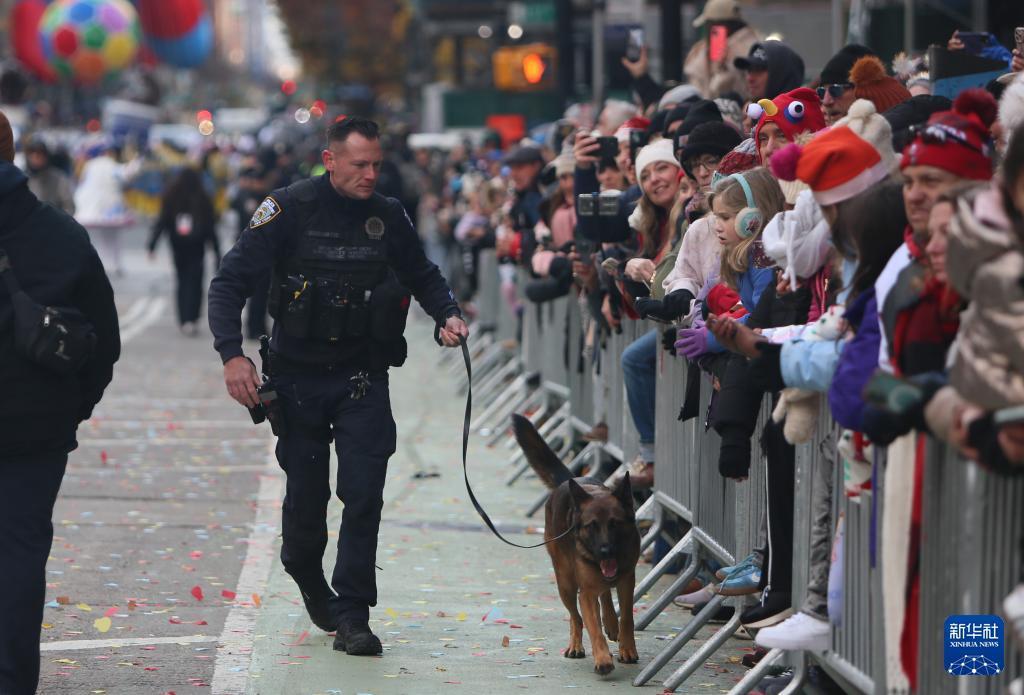 11月27日,在美国纽约,警察携带警犬在感恩节游行活动现场值守。 由于近期美国发生多起安全事件,纽约在感恩节游行区域设置了数百个检查点和隔离区,部署了数千名警力并动用无人机,加强安全防范措施。 新华社记者 张凤国 摄
