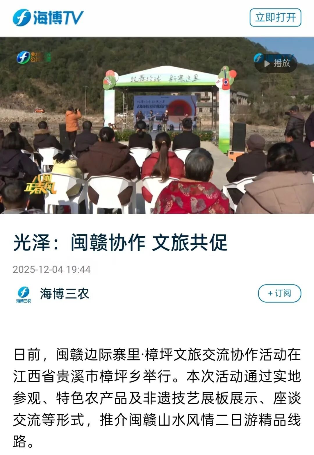 12月4日,福建电视台乡村振兴公共频道《八闽正春风》播出《光泽:闽赣协作 文旅共促》的报道。(作者:饶延平 李霖昊)