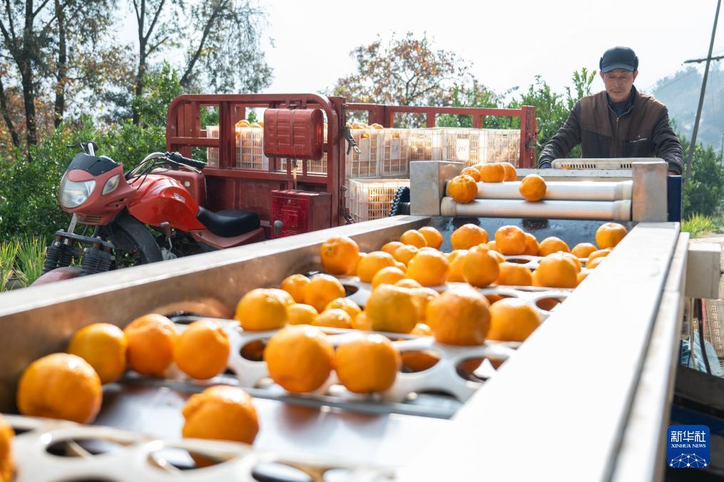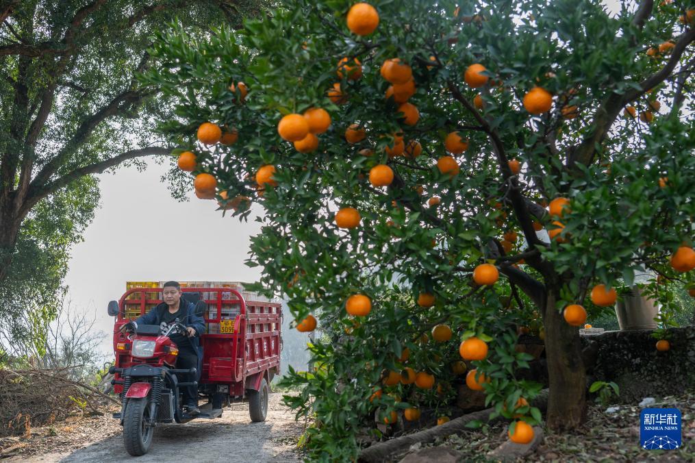 12月11日,在湖北省宜昌市长阳土家族自治县渔峡口镇岩松坪村,村民在转运刚采摘的清江椪柑。 近日,湖北省宜昌市长阳土家族自治县渔峡口镇的清江椪柑进入采销旺季。2024年,全县清江椪柑种植规模达7万亩,年产值约5亿元。产品销往全国29个省市,并出口到马来西亚、加拿大、西亚等国家和地区。清江椪柑已成为当地乡村振兴战略的支柱产业。 新华社记者 杜子璇 摄