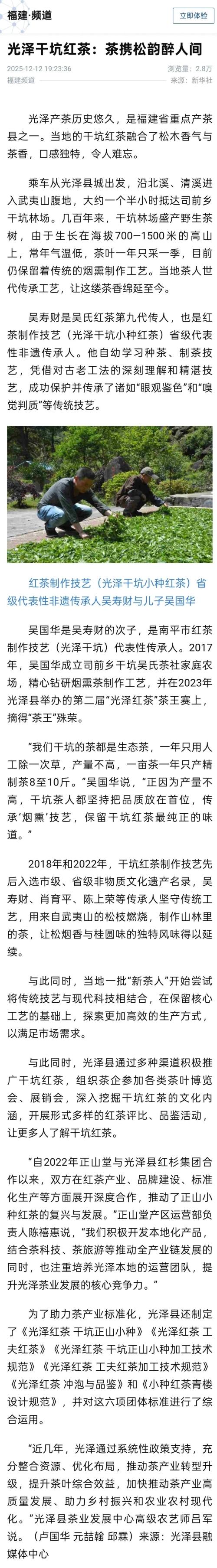 光泽产茶历史悠久,是福建省重点产茶县之一。当地的干坑红茶融合了松木香气与茶香,口感独特,令人难忘,获新华社客户端关注,发布《光泽干坑红茶:茶携松韵醉人间》的报道。