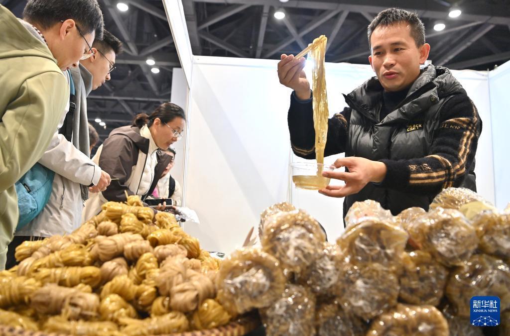 1月24日,在广西南宁国际会展中心,一名参展商在年货大集上展示红薯粉条。 1月23日至25日,2026年广西脱贫地区农产品年货大集在广西南宁国际会展中心举行。 新华社记者 周华 摄