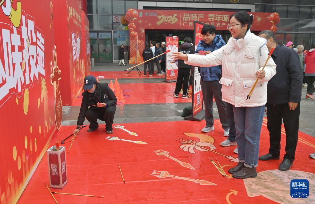 1月24日,在广西南宁国际会展中心,市民在年货大集现场体验投壶。 1月23日至25日,2026年广西脱贫地区农产品年货大集在广西南宁国际会展中心举行。 新华社记者 周华 摄