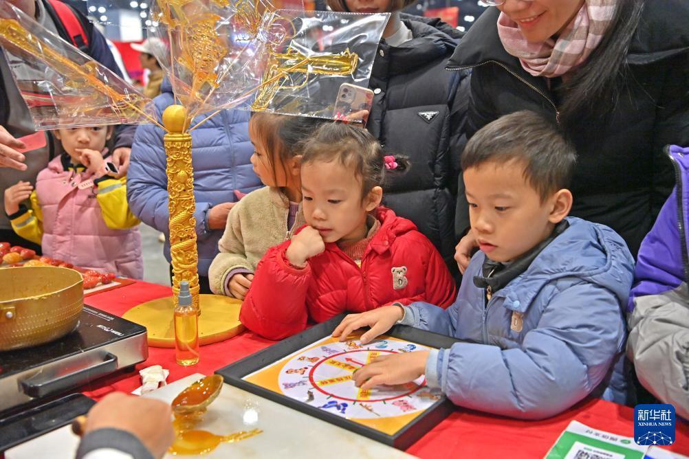 1月24日,在广西南宁国际会展中心,小朋友在年货大集上观看糖画。 1月23日至25日,2026年广西脱贫地区农产品年货大集在广西南宁国际会展中心举行。 新华社记者 周华 摄