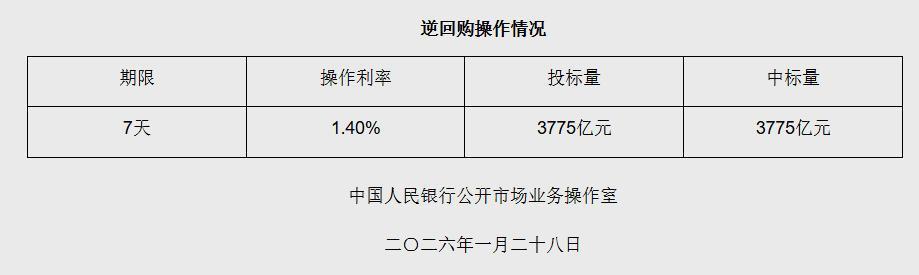 据央行网站消息,2026年1月28日中国人民银行以固定利率、数量招标方式开展了3775亿元7天期逆回购操作。具体情况如下: