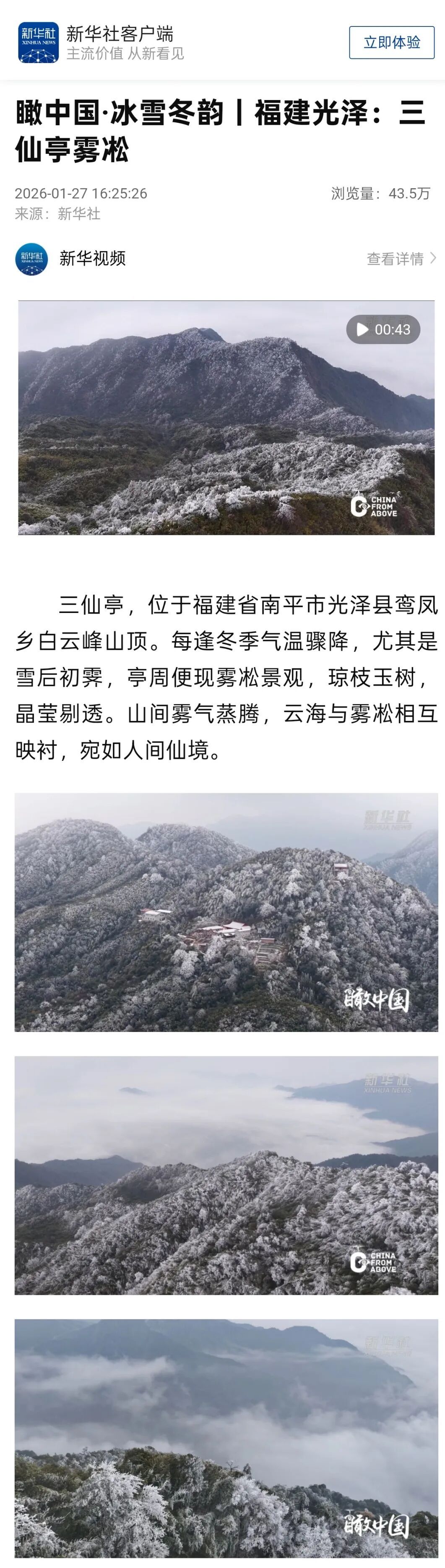 三仙亭,位于福建省南平市光泽县鸾凤乡白云峰山顶。每逢冬季气温骤降,尤其是雪后初霁,亭周便现雾凇景观,琼枝玉树,晶莹剔透。山间雾气蒸腾,云海与雾凇相互映衬,宛如人间仙境,获新华社客户端关注,发布《瞰中国·冰雪冬韵|福建光泽:三仙亭雾凇》的报道。