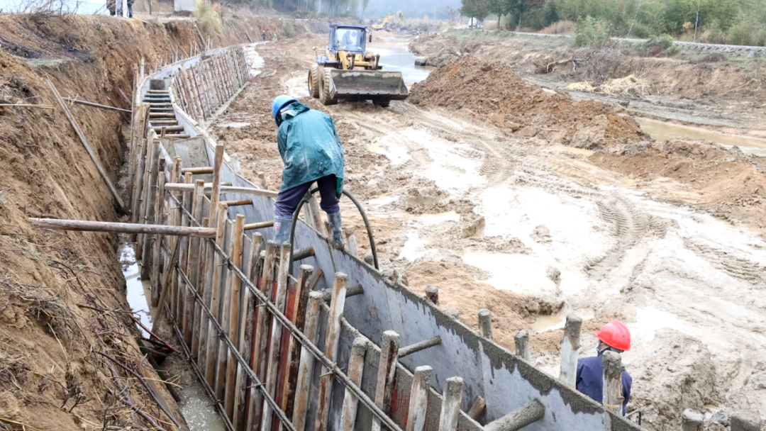 项目现场,挖机正在进行围堰拦水,工人则有序开展重力浆砌挡墙模板安装封顶、建筑墙身等作业。据了解,该项目总投资225万元,于1月8日正式开工,预计今年4月完工。项目全长一千多米,主要建设内容包括水保生态园1座、生态护岸417米、生态护脚661米、生态步道42米。目前,项目重点聚焦于河岸护岸建设。