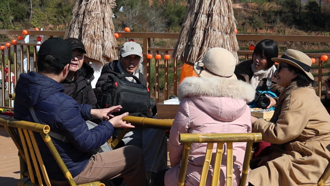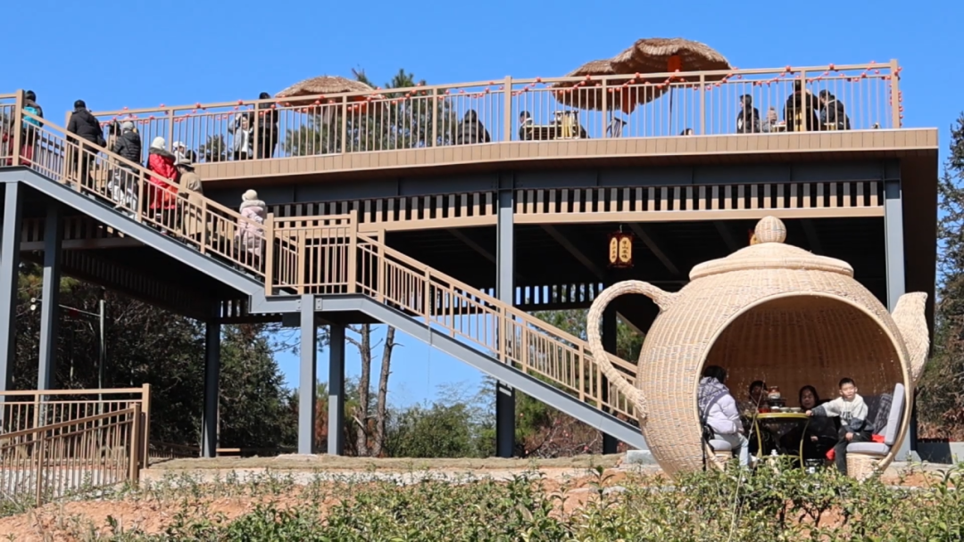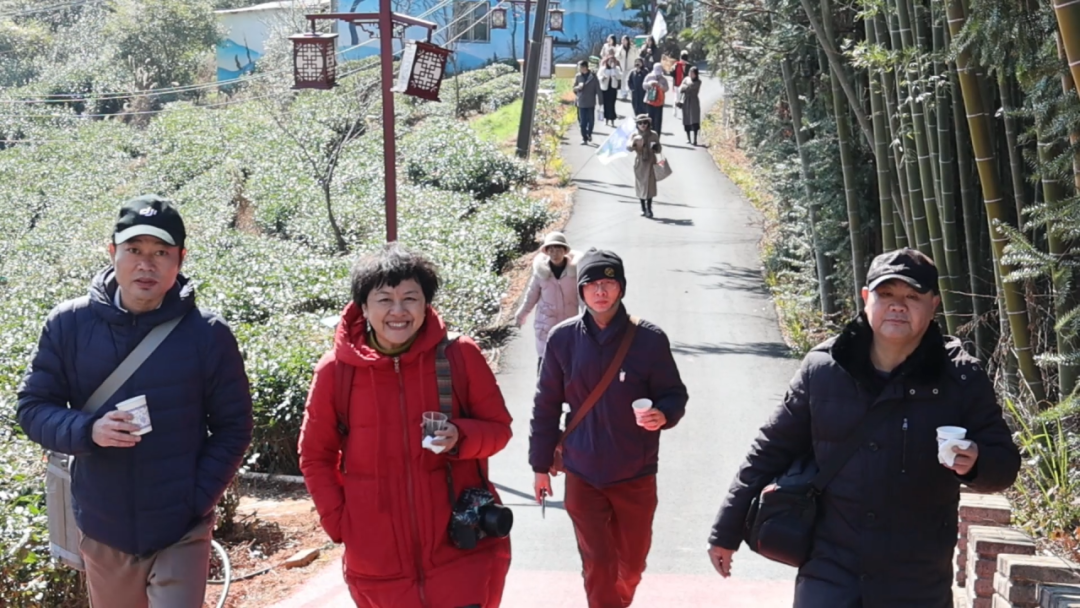 一大早,金映茶山的入口处就来了好多游客,或是举家出行的亲子家庭,或是结伴而来的年轻伙伴,还有不少返乡过年的乡贤。大家纷纷沿着茶山漫步道向上游玩,尽享茶山风光,红灯笼等新春元素装点着茶山,定格下一张张洋溢着幸福的笑脸。