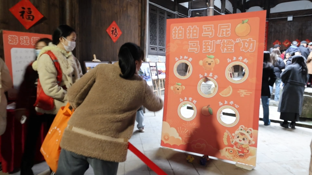 游园会现场设置了抽百福、写百福、滚滚乐、套福气、马到“橙”功、“筷”夹鸿运等趣味互动项目,现金红包、蔬果零食等好礼不断,吸引众多市民踊跃参与。摄影展集中呈现杭川镇发展新貌、自然风光、人文景观,观众可在心仪作品下粘贴点赞贴纸,共同评选“最具人气作品”。非遗体验区特邀光泽剪纸传承人罗福日现场教学,指导亲子家庭剪福字、生肖马,制作活字拓印祝福语,还可免费品尝光泽特色小吃文子,在指尖技艺与舌尖风味中感受非遗魅力。