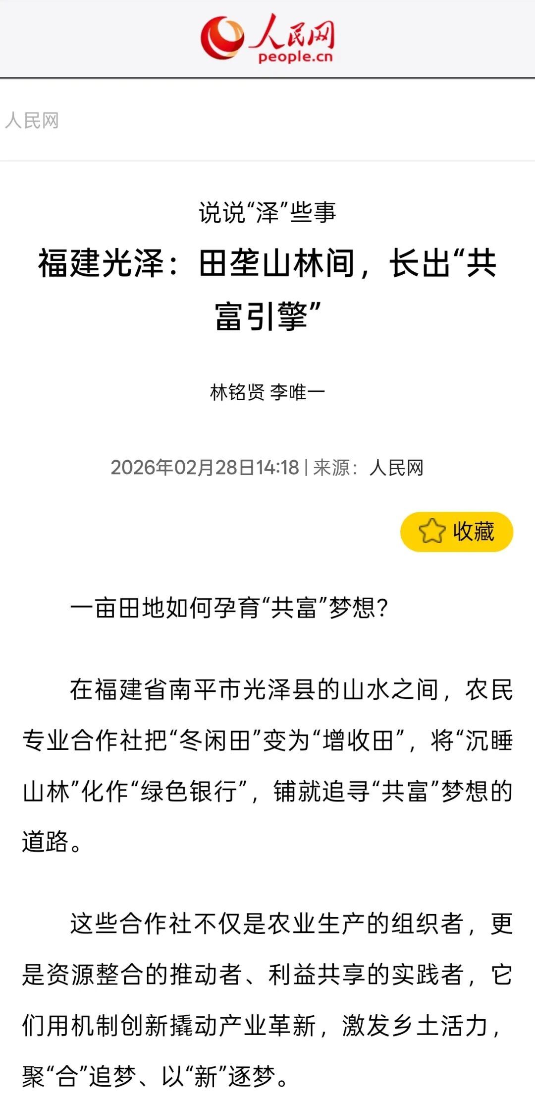在光泽县的山水之间,农民专业合作社把“冬闲田”变为“增收田”,将“沉睡山林”化作“绿色银行”,铺就追寻“共富”梦想的道路,获人民网关注,发布《福建光泽:田垄山林间,长出“共富引擎”》的报道。
