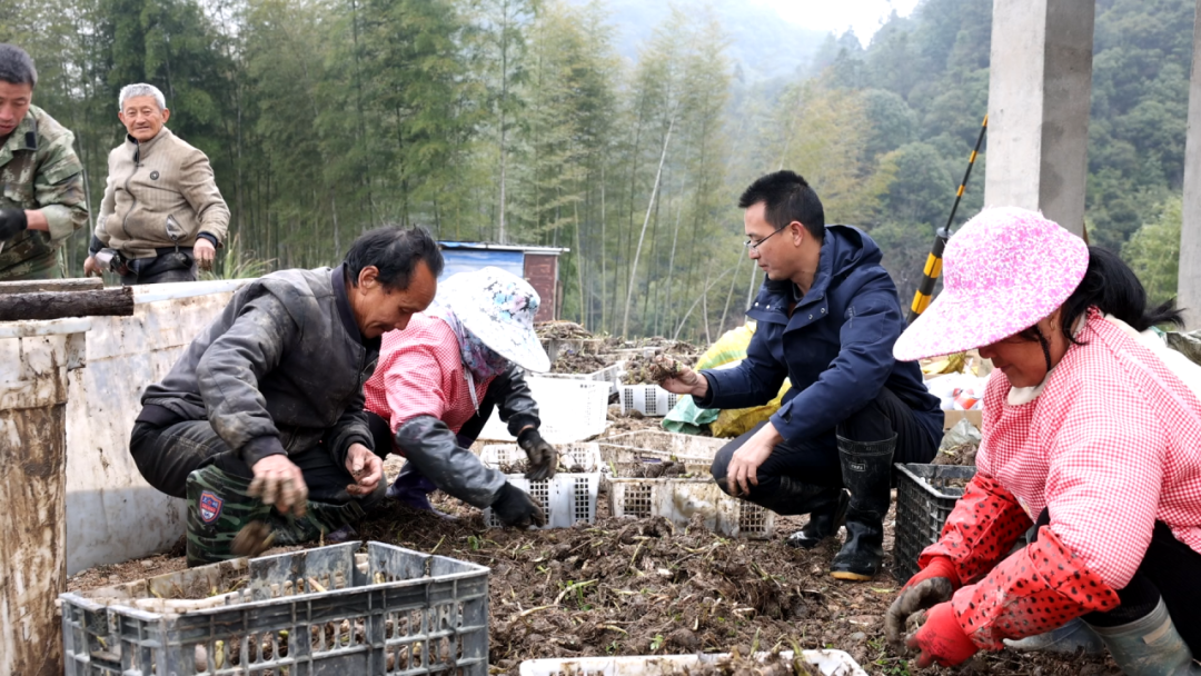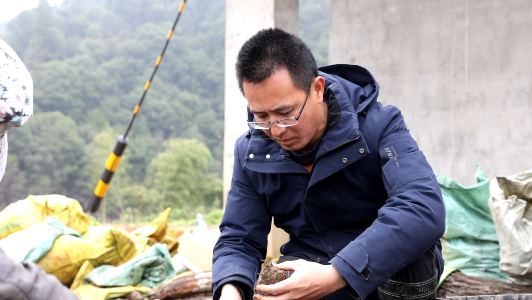 在止马水口村的槟榔芋种植基地,农户们将本地母芋繁殖的槟榔芋种苗浸入石灰水消毒,再以“三人一组”协作栽种。返乡青年刘健也在田间和农户们一起忙碌着。