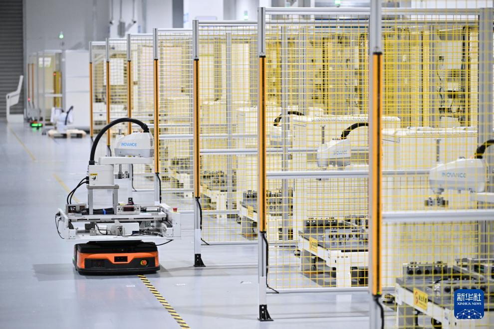 3月17日,在位于南京市江宁开发区的汇川技术南京基地自动化车间内,AGV小车在搬运完成测试的机器人。 新华社记者 季春鹏 摄
