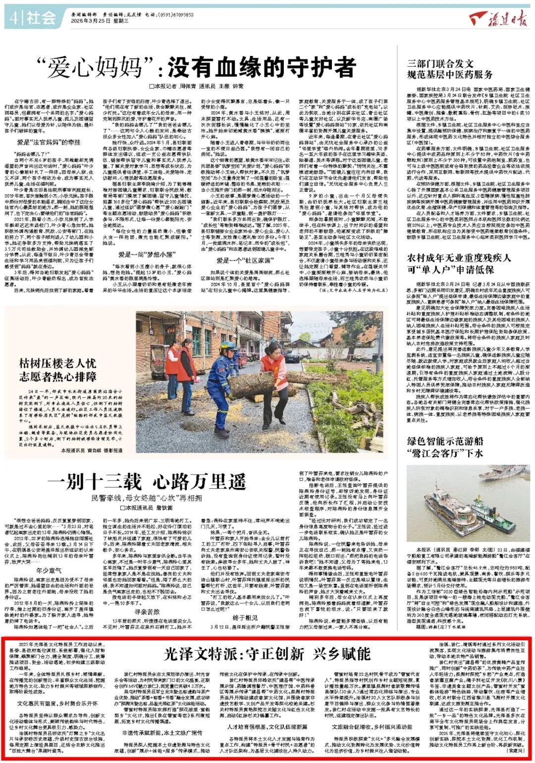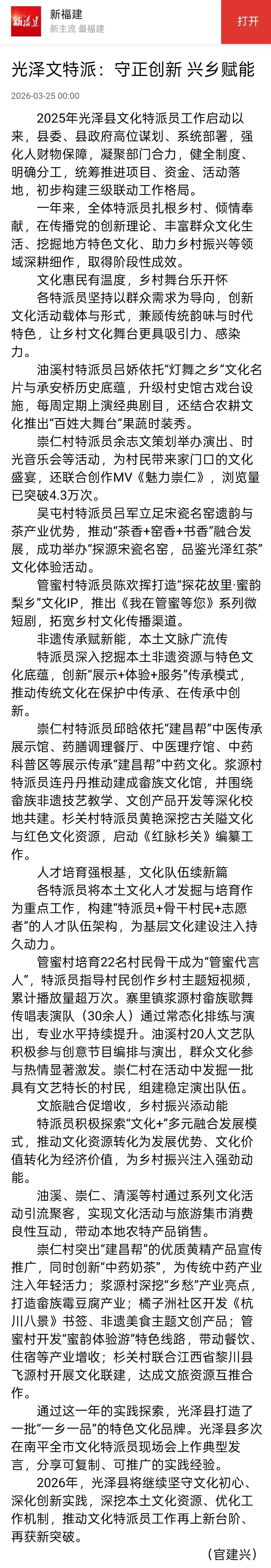 3月25日,福建日报、新福建客户端、东南网、学习强国(福建学习平台)刊发《光泽文特派:守正创新 兴乡赋能》的报道。(作者:官建兴)