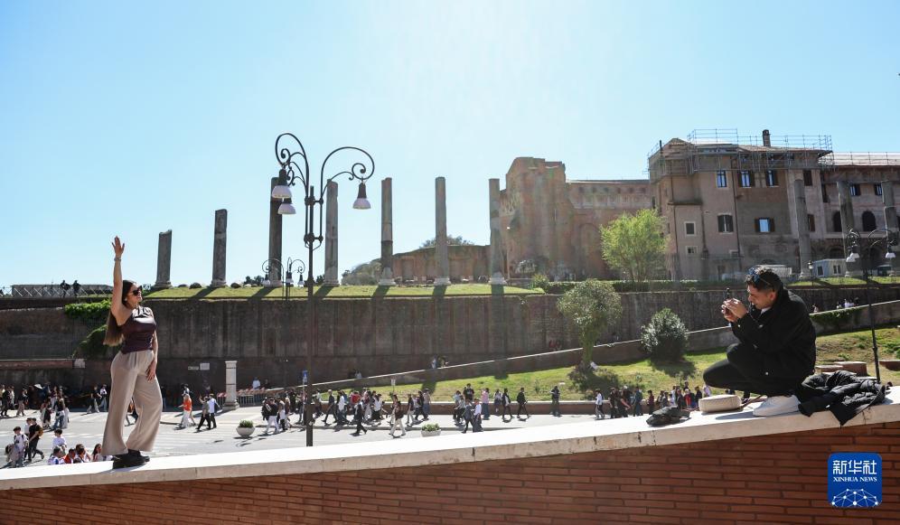 4月4日,游客在意大利首都罗马的古罗马广场附近留影。 复活节假期到来,意大利首都罗马迎来客流高峰,人们来到斗兽场、许愿池、西班牙广场等标志性景点参观游览,享受假日时光。 新华社记者 王楷焱 摄