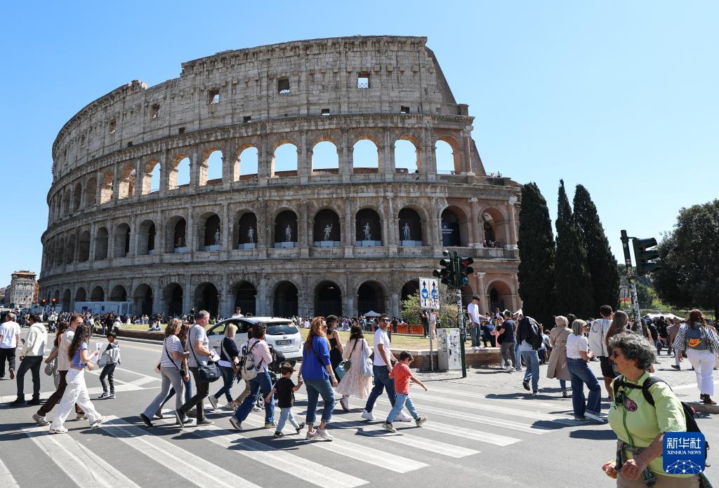 4月4日,人们经过意大利首都罗马的斗兽场。 复活节假期到来,意大利首都罗马迎来客流高峰,人们来到斗兽场、许愿池、西班牙广场等标志性景点参观游览,享受假日时光。 新华社记者 王楷焱 摄