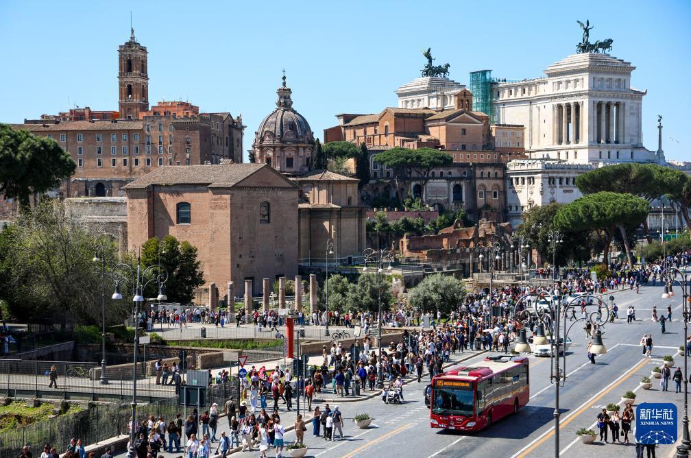 4月4日,人们走在意大利首都罗马的帝国广场大道上。 复活节假期到来,意大利首都罗马迎来客流高峰,人们来到斗兽场、许愿池、西班牙广场等标志性景点参观游览,享受假日时光。 新华社记者 王楷焱 摄