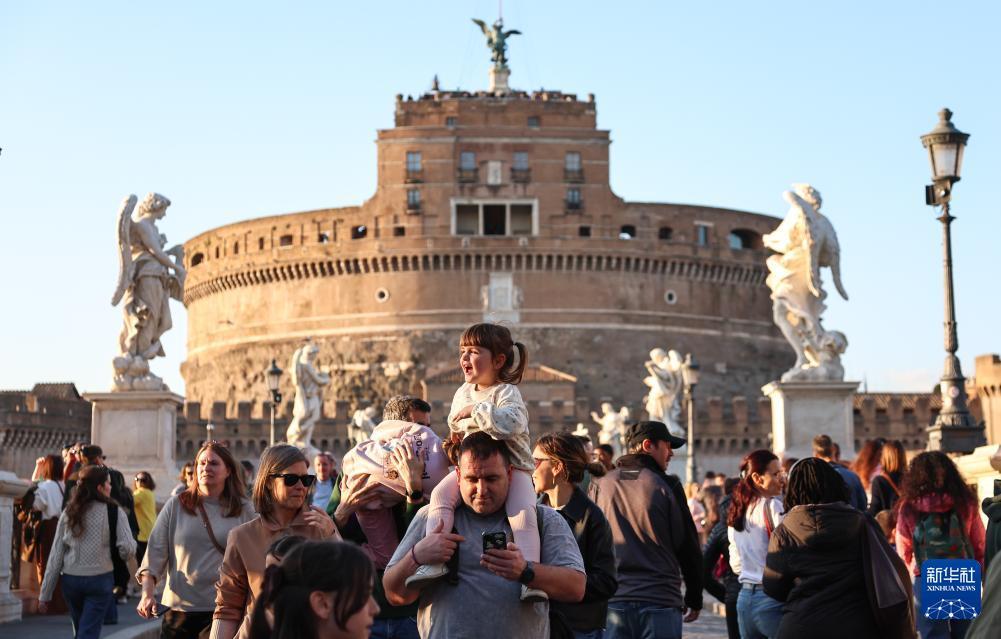 4月3日,游客在意大利首都罗马圣天使城堡前的圣天使桥上参观游览。 复活节假期到来,意大利首都罗马迎来客流高峰,人们来到斗兽场、许愿池、西班牙广场等标志性景点参观游览,享受假日时光。 新华社记者 王楷焱 摄
