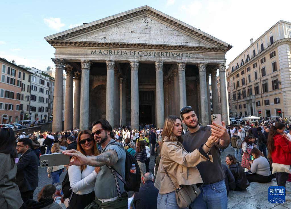 4月3日,游客在意大利首都罗马的万神殿前自拍合影。 复活节假期到来,意大利首都罗马迎来客流高峰,人们来到斗兽场、许愿池、西班牙广场等标志性景点参观游览,享受假日时光。 新华社记者 王楷焱 摄