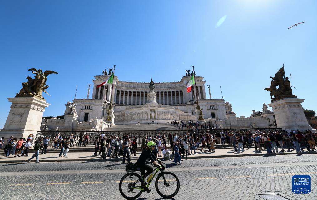 4月4日,游客在意大利首都罗马的威尼斯广场参观游览。 复活节假期到来,意大利首都罗马迎来客流高峰,人们来到斗兽场、许愿池、西班牙广场等标志性景点参观游览,享受假日时光。 新华社记者 王楷焱 摄