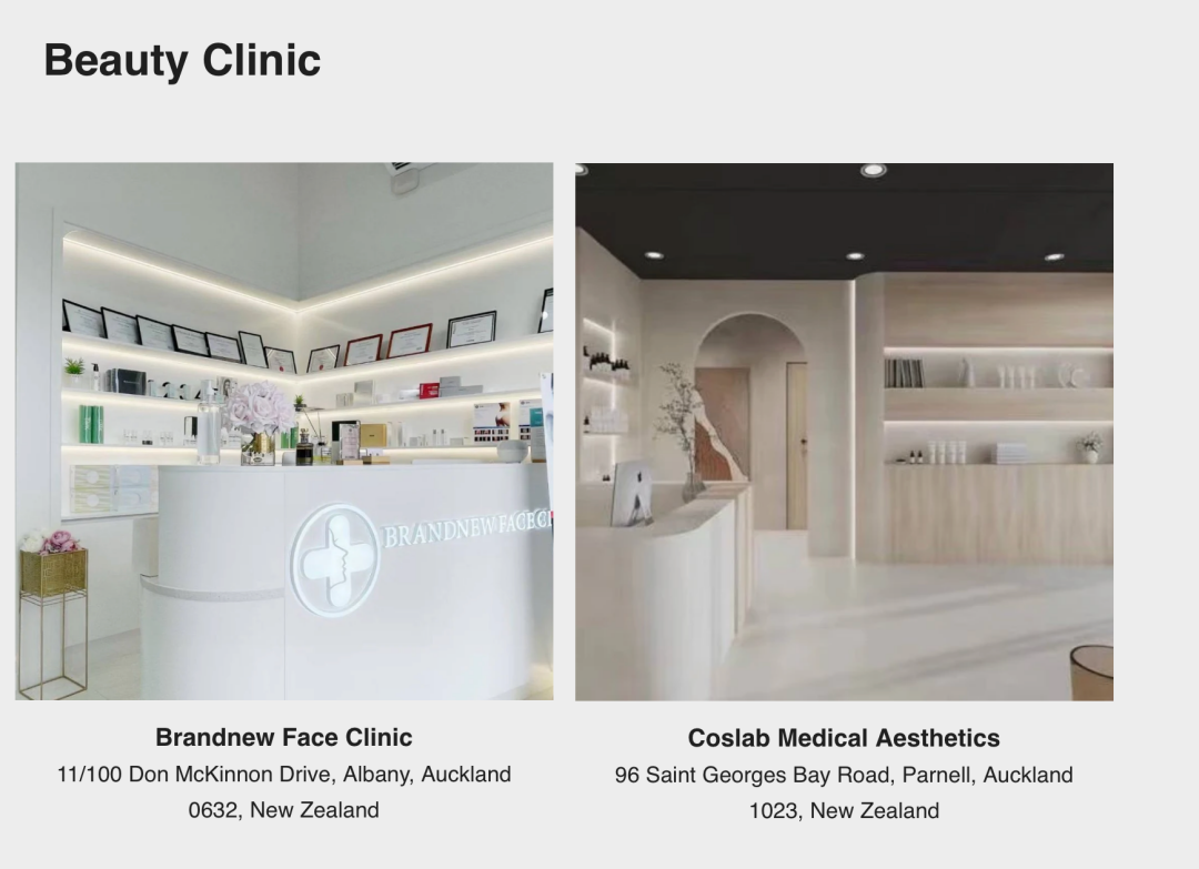 BeauEver位于新西兰高端药房LifePharmacy线下陈列 二、新西兰高端医美诊所渠道 同时,BeauEver也已成功进驻奥克兰两家享有盛誉的高端医美机构,分别为位于奥尔巴尼区的Brandnew Face Clinic与帕内尔区的Coslab Medical Aesthetics。这两家诊所均以先进的医学美容技术、严谨的专业服务体系及奢华的私密诊疗环境著称,是新西兰本土高净值人群信赖的抗衰管理地标。