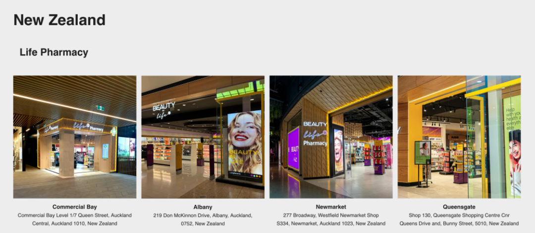 第九届中国国际进口博览会(CIIE)新西兰推介会现场 BeauEver新西兰总经理Liam Corkery 作为在新西兰本土深耕多年的高端抗衰品牌,BeauEver已建立起一套成熟、完善且覆盖全场景的线下渠道网络,所有网点均已实现稳定运营,深度渗透本土高端消费圈层。凭借其获得的新西兰政府银蕨标志(FernMark)官方认证所带来的卓越品质与信任背书,这些本土渠道已成为品牌全球化发展的坚实基石与品质展示窗口。具体合作渠道详情如下: 一、新西兰Life Pharmacy连锁药房渠道 BeauEver已全面进驻新西兰知名连锁药房Life Pharmacy的四大核心门店,覆盖奥克兰及惠灵顿地区主要商业中心。Life Pharmacy作为新西兰领先的健康与美妆零售品牌,以严格的选品标准和高品质服务享誉本土,为消费者提供专业、便捷的高端护肤体验。