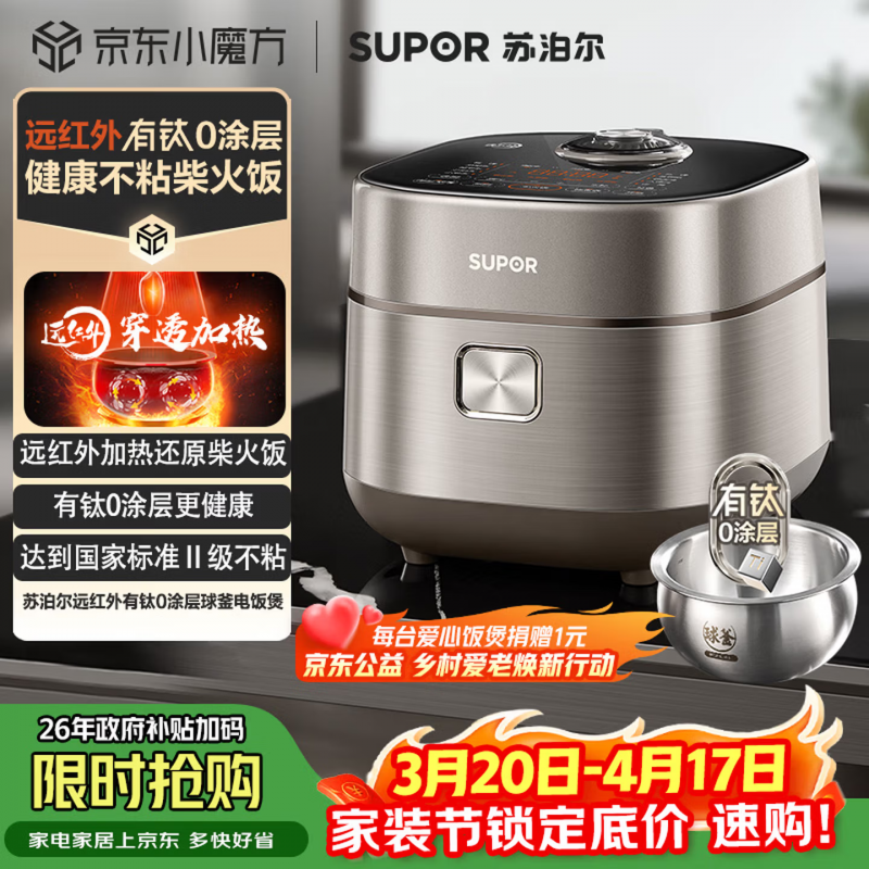 四、母婴安心党>>核心需求:0涂层、健康安全,兼顾宝宝与全家 有宝宝的家庭,选电饭煲的第一优先级就是“健康安全”,涂层脱落的隐患真的让人不放心。一款好用的母婴款电饭煲,必须是0涂层内胆,还要能做宝宝辅食,功能全面,易清洗、好打理,兼顾宝宝和全家的饮食需求。 适配机型:苏泊尔有钛不粘0涂层电饭煲SF40HC1869 这款是我给身边宝妈朋友首推的机型,苏泊尔的0涂层技术很成熟,有钛无涂层内胆,彻底告别涂层脱落的风险,给宝宝做辅食、煮软烂饭,不用担心有害物质摄入,全家吃也更安心。4L黄金容量,刚好适合三口之家,不浪费也够用,不会因为宝宝小就显得冗余。 加热方式是远红外穿透+IH猛火包裹,球形弧底能形成环流大沸腾,煮出来的米饭蓬松Q弹,米香浓郁,宝宝也爱吃饭。搭配304不锈钢蒸笼,蒸辅食、煮杂粮、炖汤一机搞定,24小时预约功能,宝妈早上出门前预约好,晚上回家就能给宝宝做辅食,不用额外费心,易清洗设计也能节省宝妈的打理时间,注重健康、有宝宝的家庭,这个价位选它绝对合适。