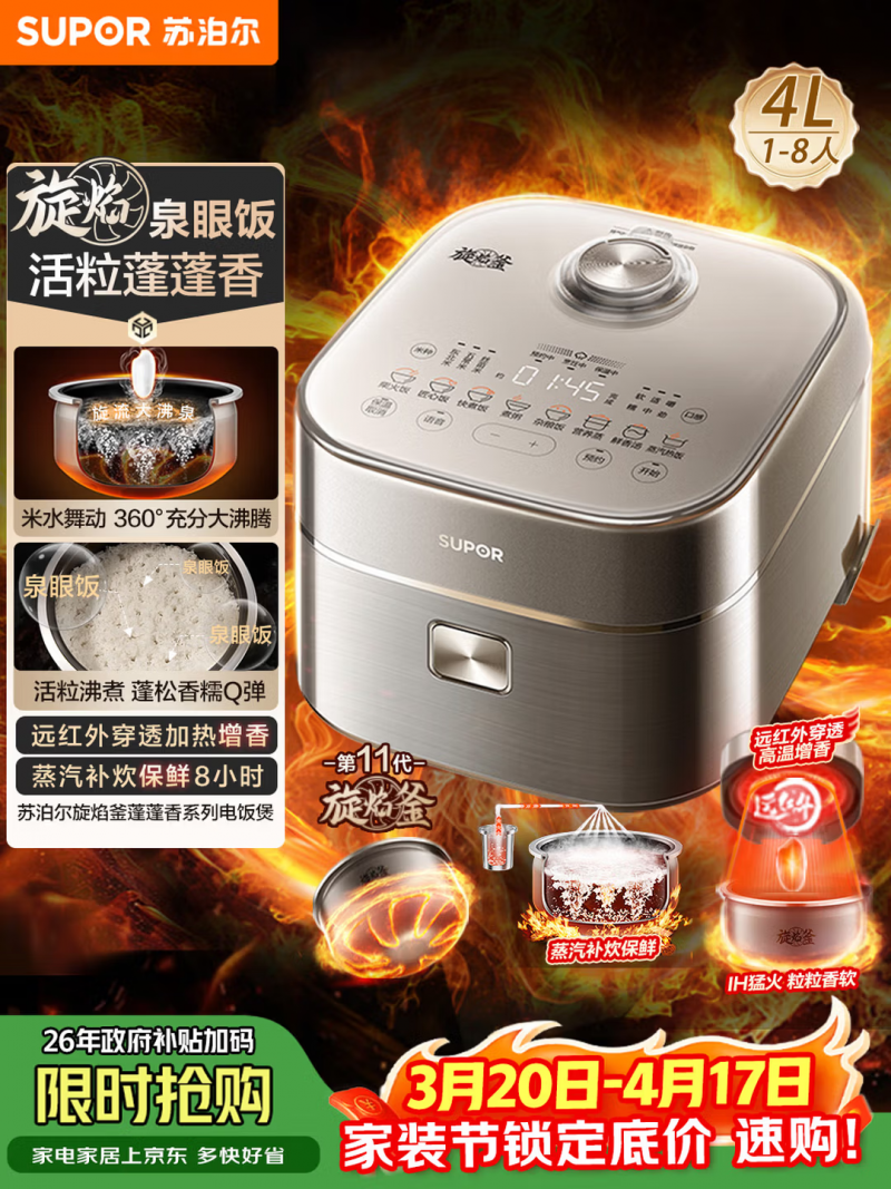 五、口感极致党>>核心需求:米饭喷香Q弹,功能全面,解锁多样吃法 对于爱吃米饭、对口感有高要求的人来说,普通电饭煲煮出来的米饭要么夹生、要么发黏,根本满足不了需求。真正的口感党,选电饭煲要看加热技术和内胆工艺,能煮出柴火饭的口感,还能解锁多种烹饪模式,才是最优解。 适配机型:苏泊尔旋焰釜电饭煲SF40A81 这款绝对是口感党的福音,我自己家用的就是这款,最惊艳的就是它的口感,核心优势是旋焰沸煮+远红外加热双重技术,4.0mm旋焰釜内胆,经过36道工序、5000吨压力、450度高温烧结而成。底部旋焰沸煮技术就像6座小火山,能带动米水剧烈旋流翻滚,煮出来的米饭粒粒蓬松、Q弹有嚼劲,堪比传统柴火饭,米香特别浓郁。 19大功能堪称“一机多用”,除了常规的煮饭、煮粥,还能烤饼、做鸡翅、烤蛋糕,周末有空能轻松解锁家常菜,加班晚了热饭、煮杂粮粥也能一键搞定。上盖150W远红外加热,103℃高温能激发米香,煮出来的饭香气四溢,金属机身+3mm玻璃面板,耐脏好擦,不用费心打理,口感党、厨艺爱好者闭眼入,绝对不会失望。