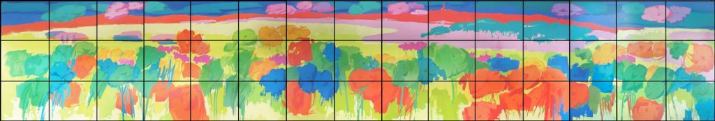———《色彩杭州》丙烯 145 x 360 cm ——国家文化自信的视觉表达:让城市有了“心跳” 在晨晓看来,色彩的使用不仅关乎视觉审美,更是一种具备“情绪引导功能”的感性逻辑系统。他提出的“色彩是感觉的逻辑结构”这一主张,让色彩“像音乐一样引导情绪”,让城市建筑具有“可以感受到的心跳”。 这种艺术理念已在众多公共空间得到验证。晨晓的众多大型作品已被多地政府、图书馆、机场、地铁、音乐厅采用为公共艺术壁画。杭州地铁站的巨幅作品《一池荷叶》便是明证,作品摒弃传统文人画的灰调,大胆运用明亮的琉璃黄象征生命勃发,深邃的湖蓝隐喻天地澄明,以现代色彩语言转译东方美学精神,成为中国最美的地铁站壁画。 他以自己的色彩系统参与城市美学建设,使艺术真正走入公共空间,实现了“城市有了文化特征,人民看到了城市精神”的愿景。这不仅是艺术形式的胜利,更是文化自信的视觉表达。 ——艺术家的社会责任:大众艺术论 作为中国好色彩代表艺术家,晨晓从未把艺术困在画廊和收藏体系里。他坚信,艺术要为人民服务,色彩要对社会负责。他为杭州市奥体实验小学打造“中国最美地下空间”,将原本冰冷阴暗的地下车库接送区改造为充满童趣的艺术长廊。他为杭州大剧院创作的《新音乐之声》、为杭州亚运会创作的《新富春山居图》系列,都以色彩传递着积极向上的情感力量。