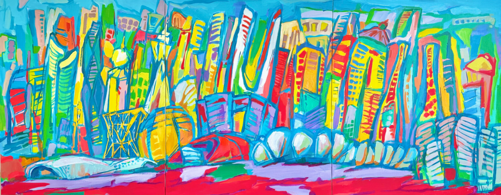 ———— 《一池荷叶》15.45 m x 2.61 m ——从“看见”城市到“读懂”城市 每一座城市,都是时代的投影。高楼、桥梁、塔楼、剧院——这些地标建筑不只是空间的构件,更是城市精神与文化记忆的物质承载。然而,在城市化进程加速、城市面貌日趋同质化的今天,如何避免城市“千城一面”,如何让冰冷的建筑拥有可被感知的温度?晨晓给出的答案是:用色彩解码城市精神。 “色彩不只是看见的经验,更是文化的温度,是一个民族情感的深层投射。”晨晓如是说。这位出生于浙江杭州,26年海外之旅,游历80多个国家和500多个城市的艺术家在2013年回归祖国,开启了他的“中国色彩”之路。 在“Landmark China”系列创作中,晨晓打破了传统建筑图像仅停留于工程学或摄影记录的局限。他以“色彩”为媒,连接建筑的物质性与文化的精神性——他画的是建筑,但不是钢筋水泥;他绘的是城市,但又超越地理版图。在他笔下的广州不是钢铁冷色,而是金红与水蓝交织,象征岭南文化的热烈与包容;上海陆家嘴的色调由紫转青,如烟似梦,勾勒出这座城市的梦幻气质与中西融合的文化气场。