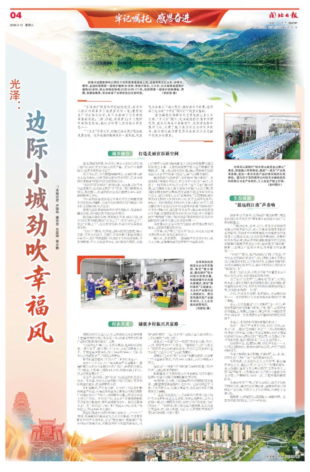 武夷天池国家森林公园位于光泽县清溪流域上游,这里有南方红豆杉、钟萼木、银杏、金钱松等国家一级保护植物30余种,有南方铁杉、三尖杉、沉水樟等省级保护植物60多种,陆生脊椎动物有23目55科171种,包括国家一级保护动物蟒蛇、黑麂、黄腹角雉等,突出体现了光泽优良的生态环境。(李霖昊 摄) 上下联动治水、治林、治气,率先在全域成功创建五星级幸福河流,近五年来水环境质量稳居全省前列,国内单体处理规模最大的畜禽类污水处理工程建成投运;成功创建森林城镇、森林村庄等系列品牌,完成森林质量精准提升和打造色彩斑斓的森林景观23.2万亩;尝试建设“绿岛链”破解工业园区产业异味难题的举措为全国首创…… “十四五”期间,光泽坚持践行“两山”理念,争当生态文明建设“优等生”,突出保护武夷山国家公园,以秘境为主题、以工旅为特色、以融合为路径的全域旅游格局初步形成,被《中国国家地理》誉为“最远的江南”。 依水而生的光泽,人均水资源占有量是全国平均水平的12倍,全流域水质常年全优。 为了做活“水文章”,让绿水变“富水”,光泽组织专业力量对县域内水资源情况进行全面调查,将当地所有涉水工程、可开发利用的水资源按功能分类,绘制出水资源“一张图”。 之后,开展水系治理、水库建设、水岸整治提升……一系列前期工作为水资源的合理利用打牢了基础。 并且,光泽还通过“水生态银行”这一平台,将原先零散的水资源集中收储、开发、提升,在保护水质的基础上,发展出包装水、绿色种养、休闲旅游等产业,探索出一条水资源生态价值转化的绿色发展路子。 水活了,水资源的价值转化路径也通了。 推进“一瓶水”产业体系发展,引进“武夷山矿泉水”项目,建设“玉女峰矿泉水”生产线;鸾凤镇饶坪村依托饶坪溪,发展房车露营基地;司前乡清溪村清溪河无动力漂流项目正式运营,不光盘活了村里的水资源,也给村民带来了实实在在的收入。