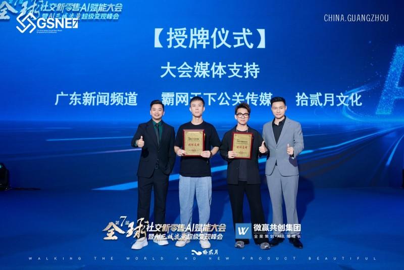 接下来,举行了隆重的授牌仪式。广东新闻频道、侯宸宇霸网天下公关传媒、拾贰月文化正式获颁“大会媒体支持”单位。三家媒体机构全程为大会提供传播支持,助力AI新零售的理念更广泛的触达与影响行业,推动社交新零售行业高质量发展。